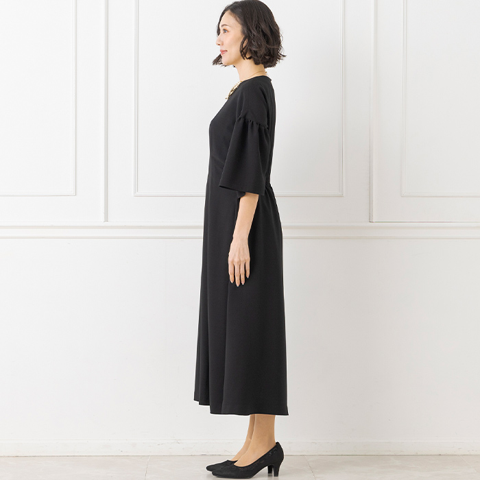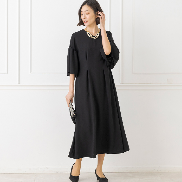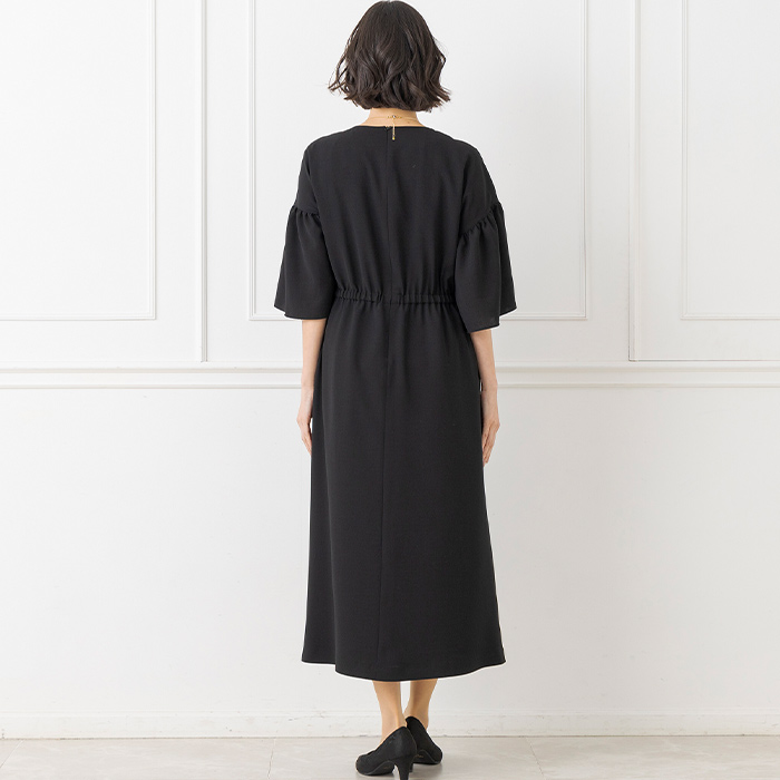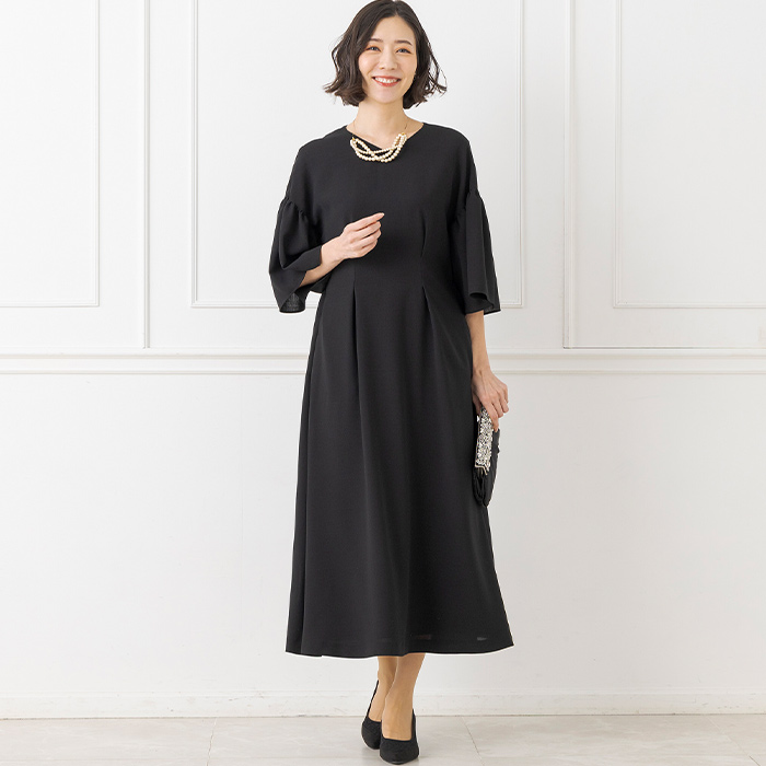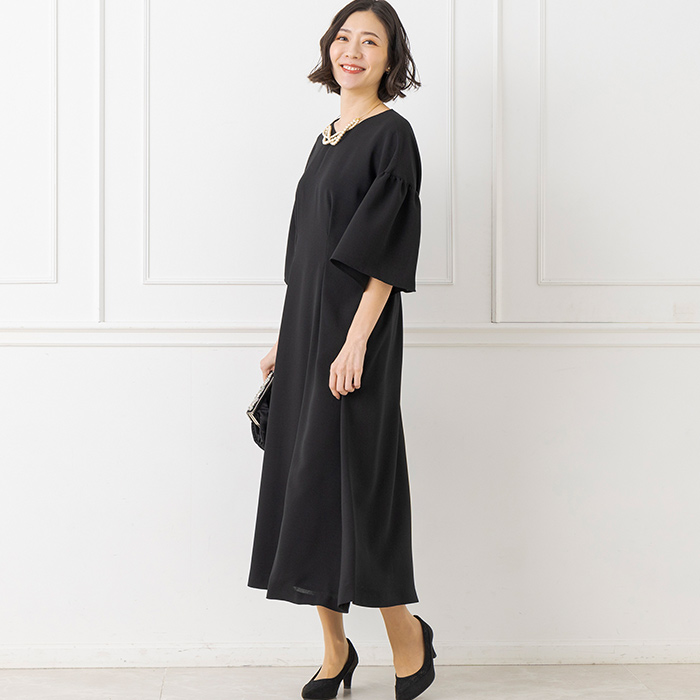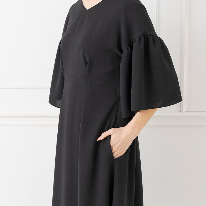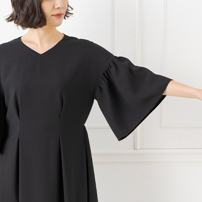 フレア袖のおしゃれなウォッシャブルワンピースドレス。