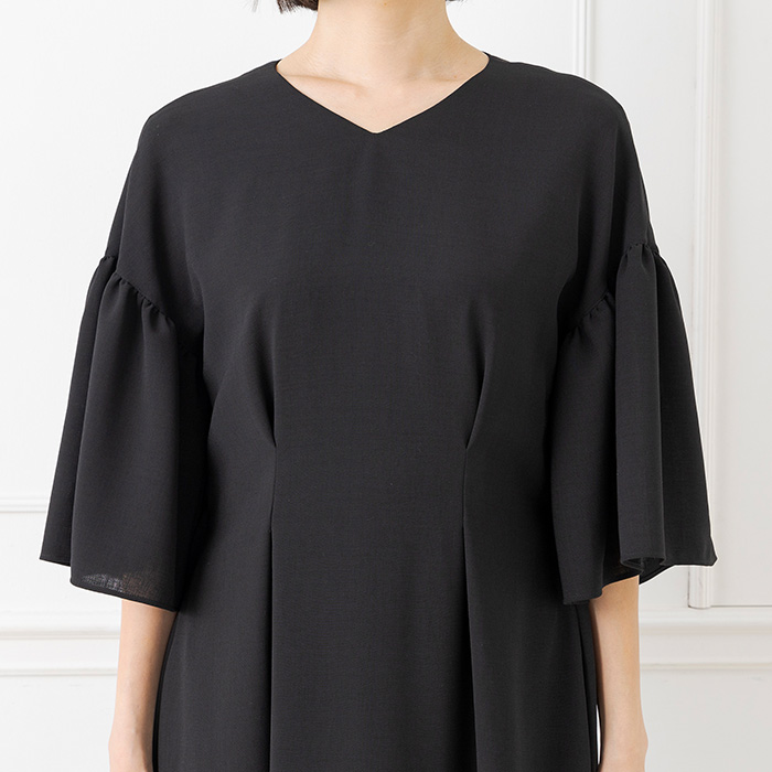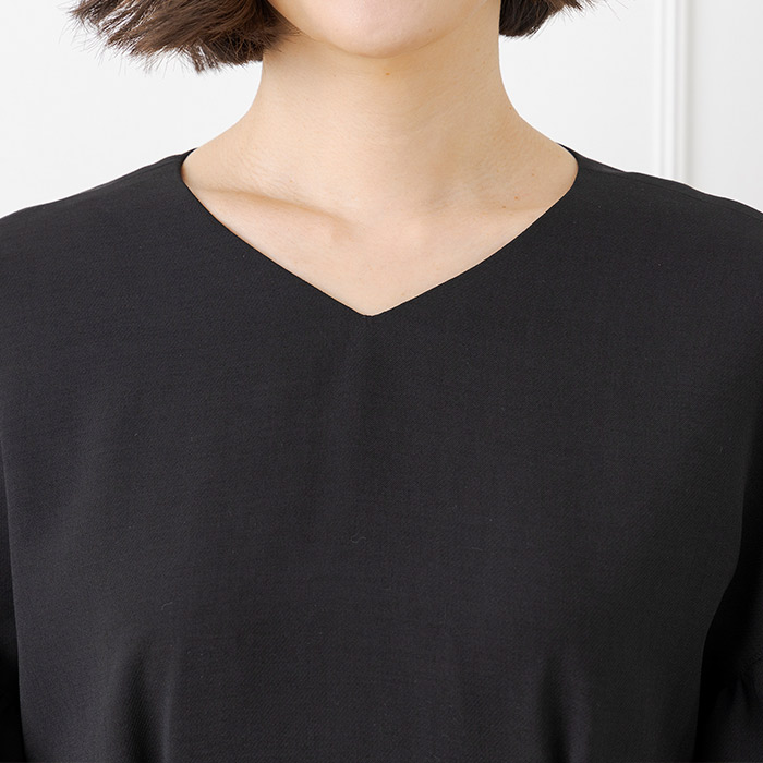 女性らしいすっきりとしたⅤネックに、ボリュームのあるお袖をポイントにデザインしました。結婚式からお食事会まで幅広いオケージョンでご利用頂けます。