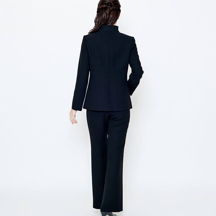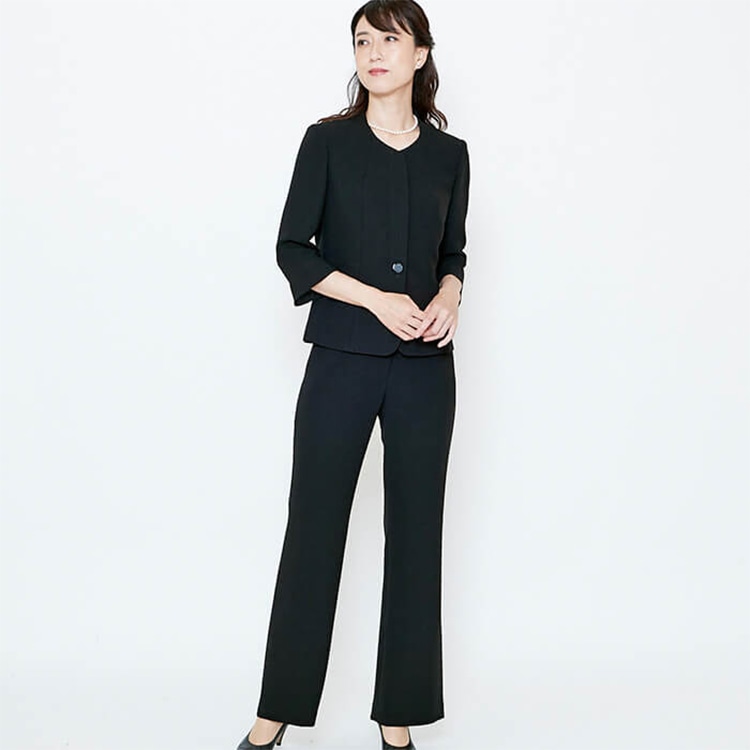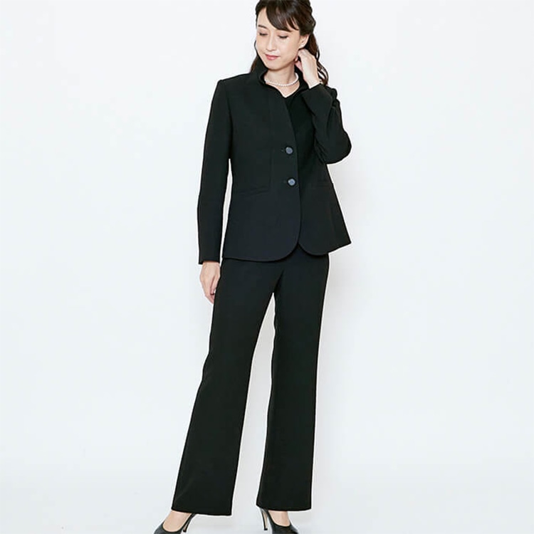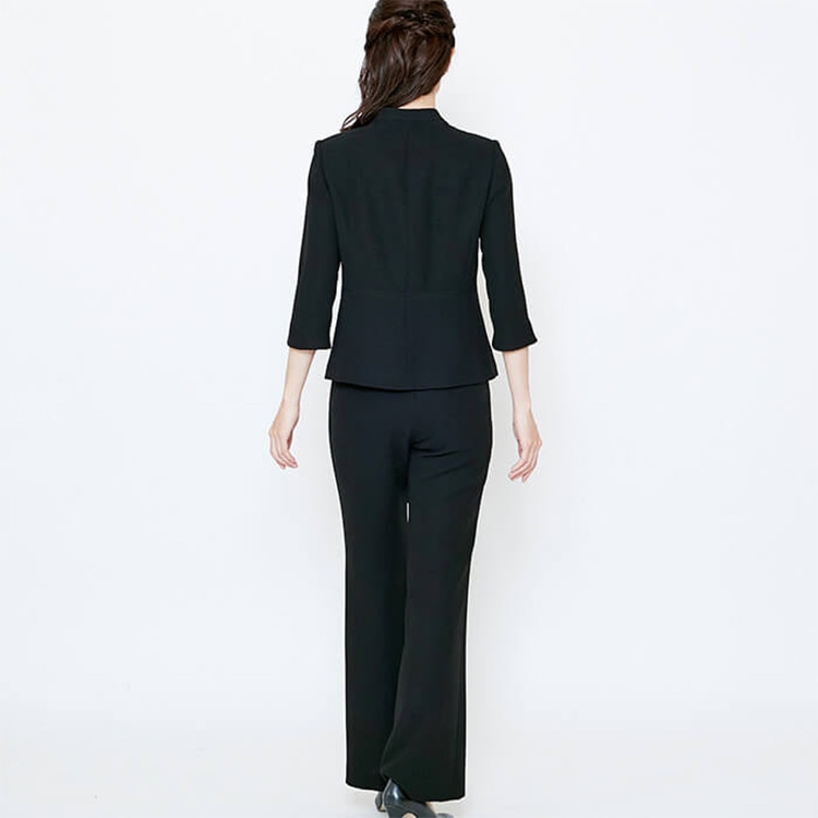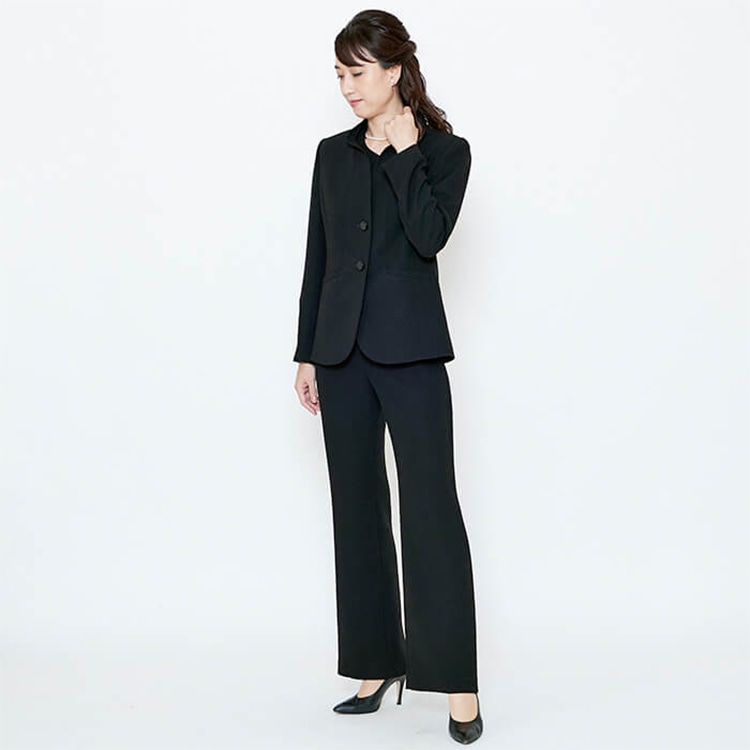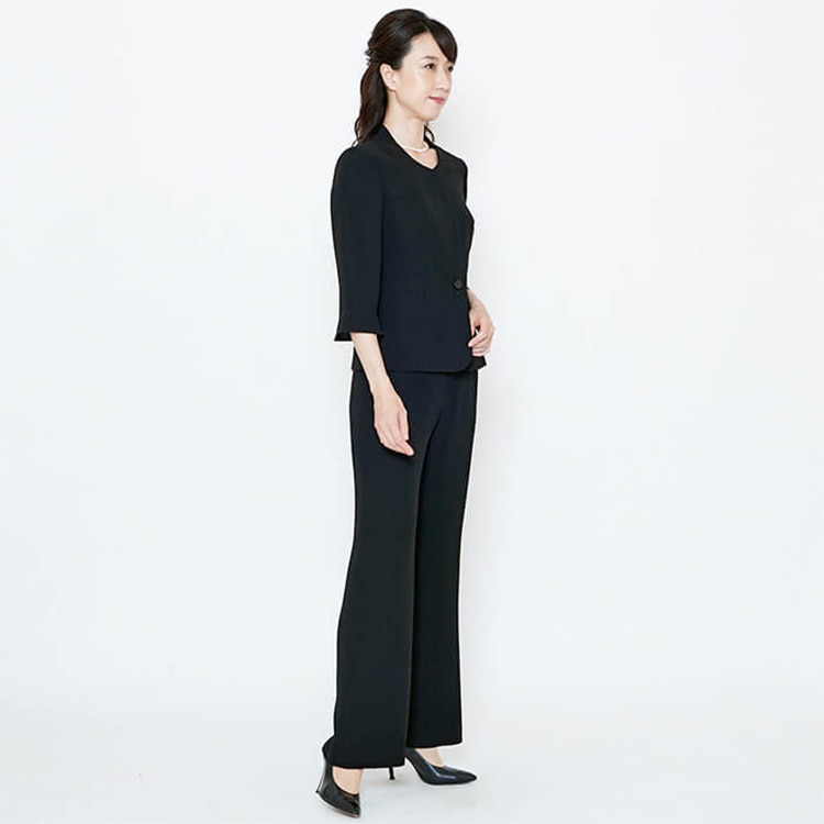 寒い季節に最適な、暖か素材「ヒートエナジー」を使用したブラックフォーマルのパンツスーツ。