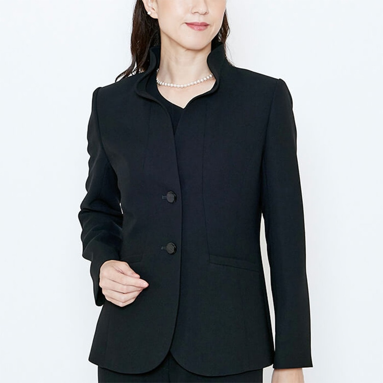 丈が長めのスタイリッシュなジャケットに、ノーカラーのブラウスとストレートシルエットのパンツをセットにした3点セット。 スタンドカラーがモダンなジャケットは両側に便利なポケットがあります。 ブラウスとパンツはジャケットと同じ生地を使用、パンツは前にファスナーのあるタイプです。 ウエストは脇から後ろにかけてゴムが入っています。 寒い季節も暖かな着心地が嬉しいミセスにおすすめの一着です。