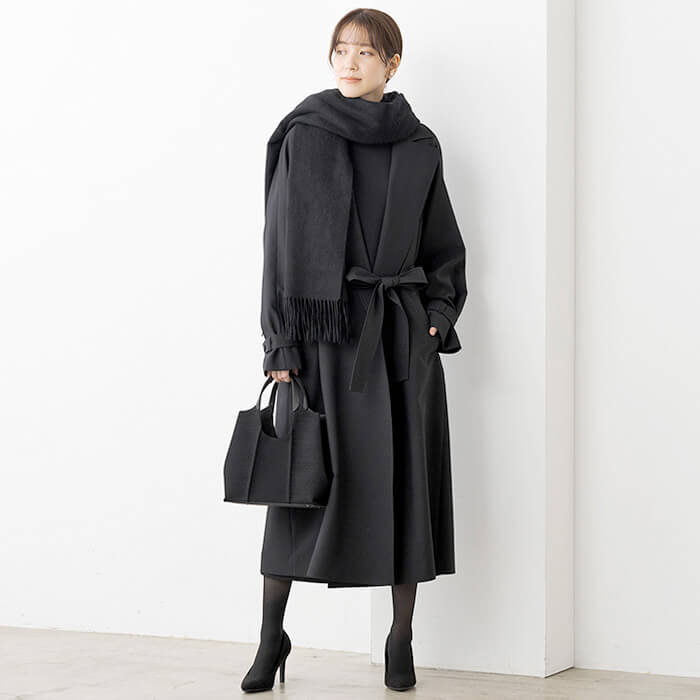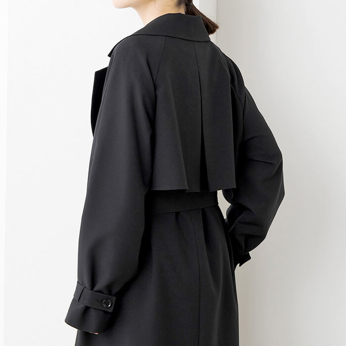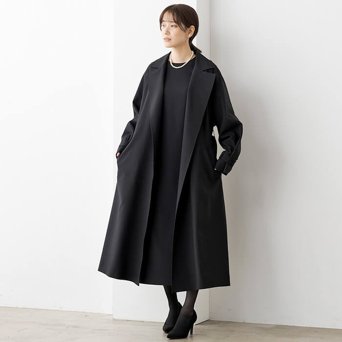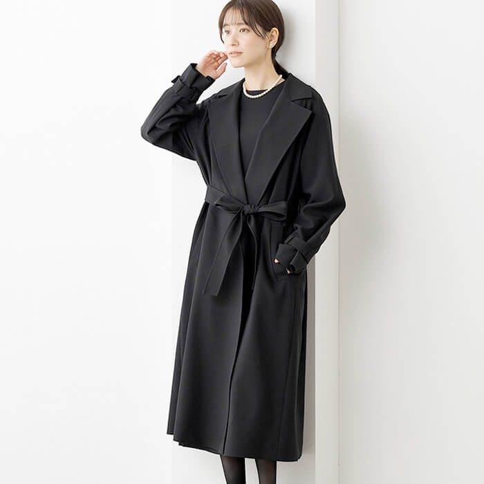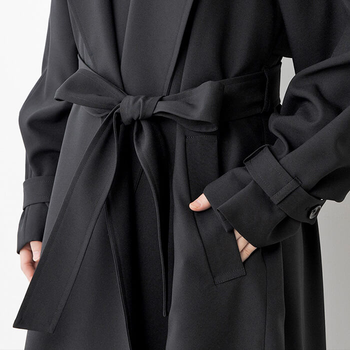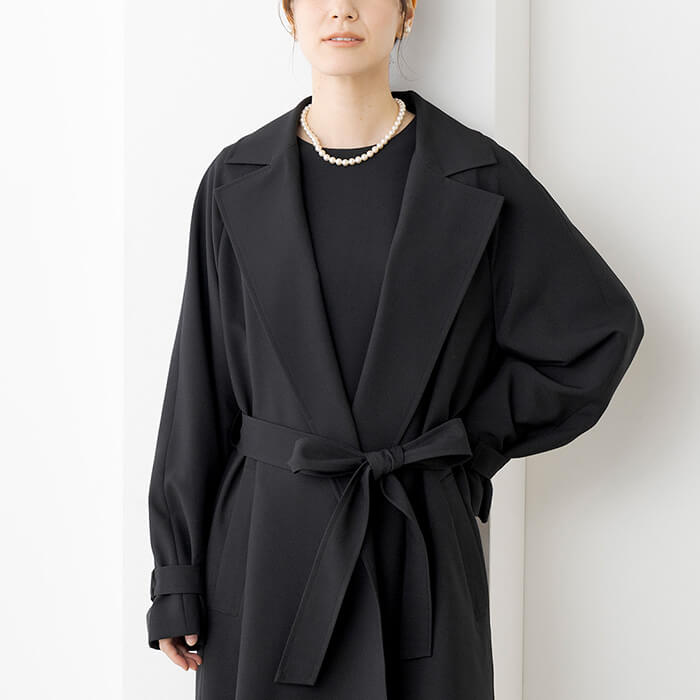 トレンチ風のボタンレスのコートは、軽く羽織ったりベルトできゅっと締めたりと2WAYの着こなしが可能。袖には少しボリュームを加えているので、中に着るアイテムの袖を気にすることなく着用できます。非ウール素材を使用しているので、秋口から春先まで長い期間着用できるコートです。