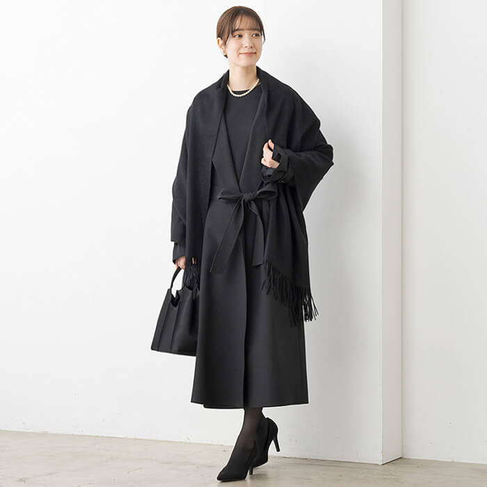■ボタンレスの2WAYコートサッと羽織っても、共布のウエストベルトでキュッと絞めても着ていただける2WAYタイプです。ストールを羽織るコーディネートもおすすめ。
