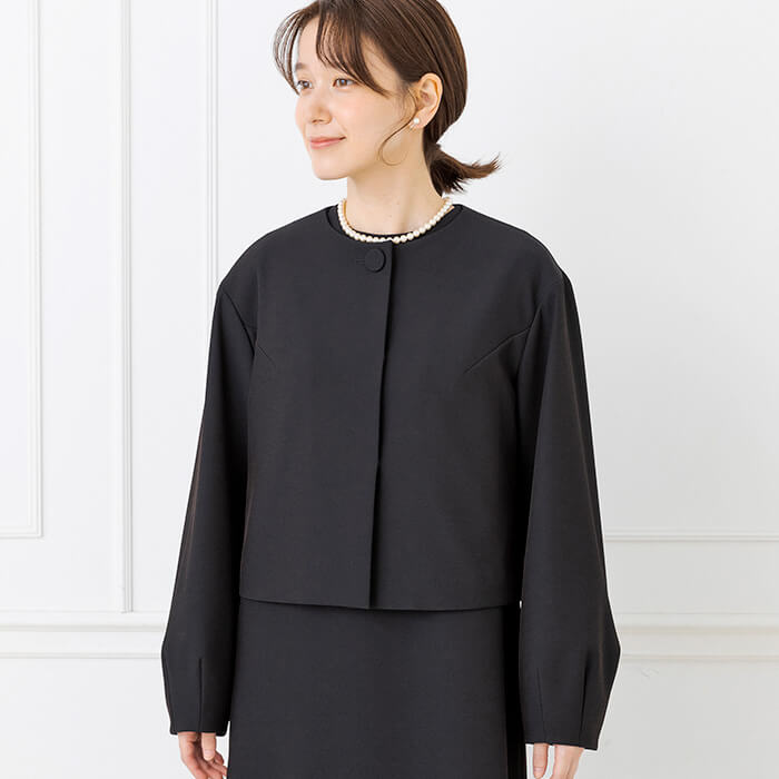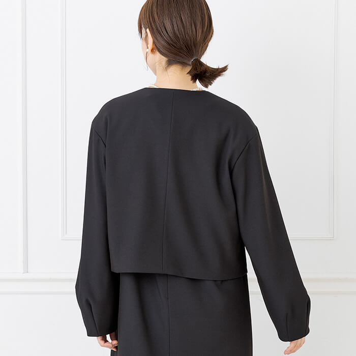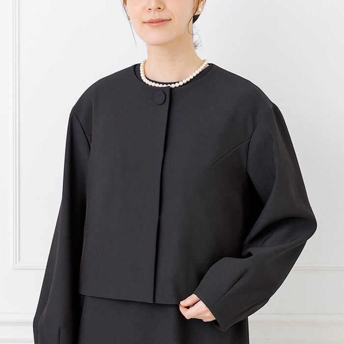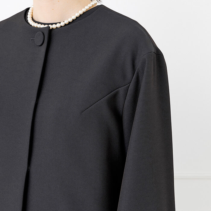 コンパクトで着回ししやすいジャケット。タックをとったボリュームスリーブがモダンなシルエットです。丸いボタンと内側の2つのスナップどめでしっかりとめられます。