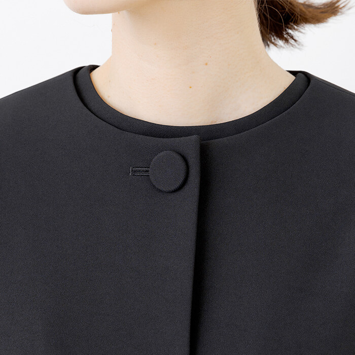 ■1つボタンがポイントのノーカラーシンプルなノーカラージャケット。襟ぐりの丸いボタンは優しい印象です。