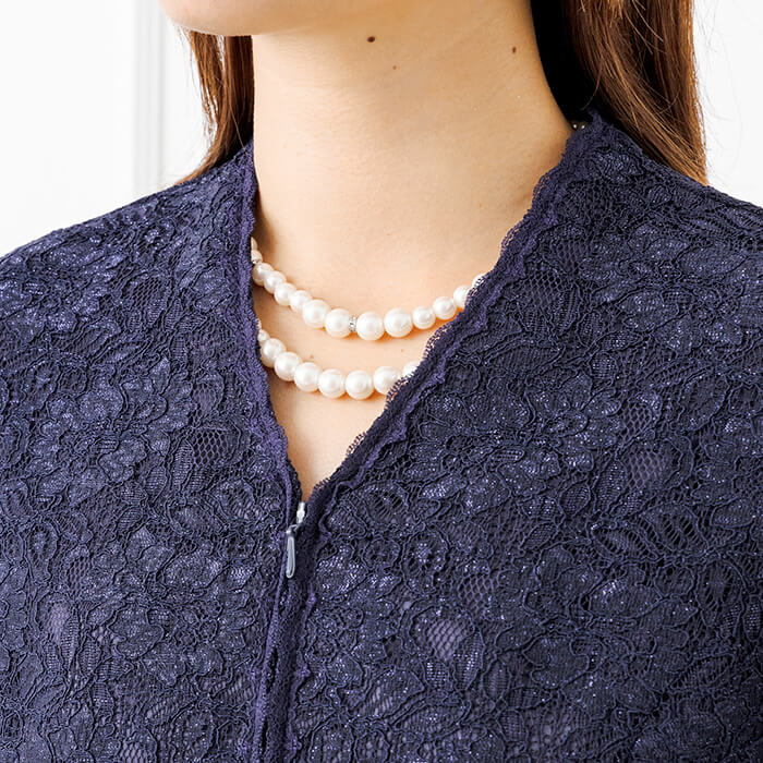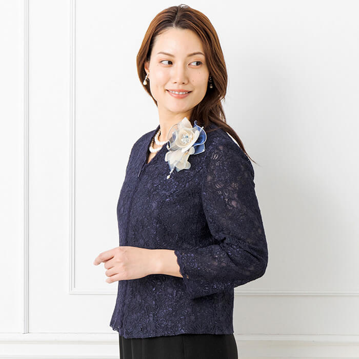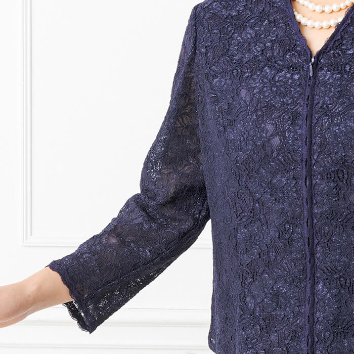 小さめのモチーフなので透け感が目立ちにくく、上品で着やすい柄のラメレースのブラウスです。襟ぐりは首に沿うラインで、すっきりとした開き具合。スカートやパンツに合わせたスタイルはもちろん、ファスナーを開けてワンピースに羽織りとして着用することができます。ファスナーは上からも下からも上げ下げできる仕様です。