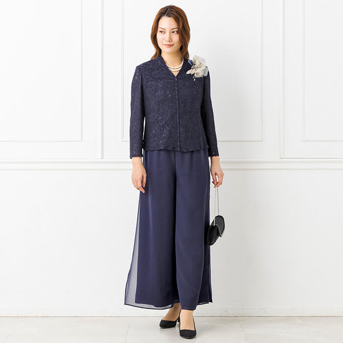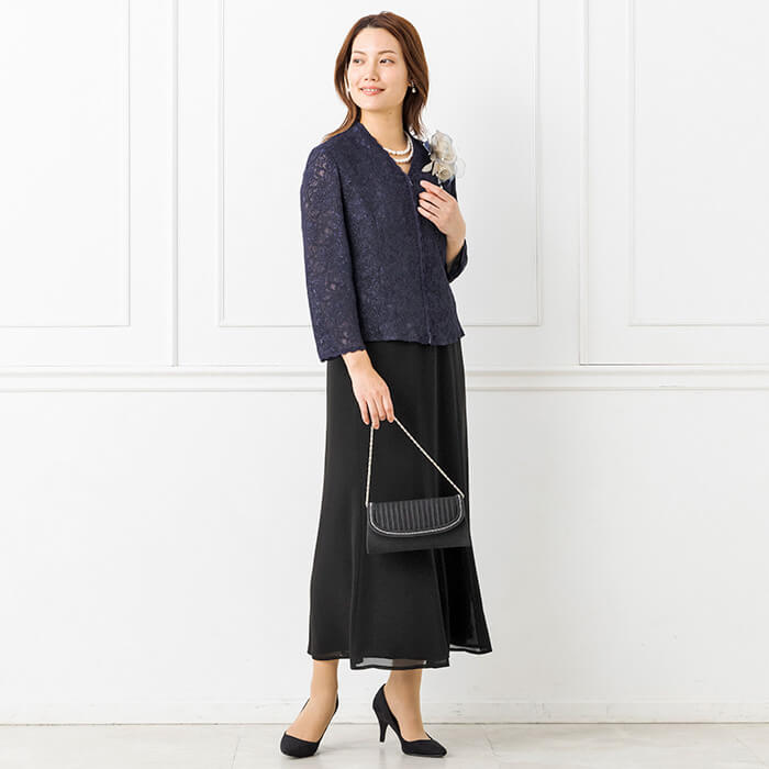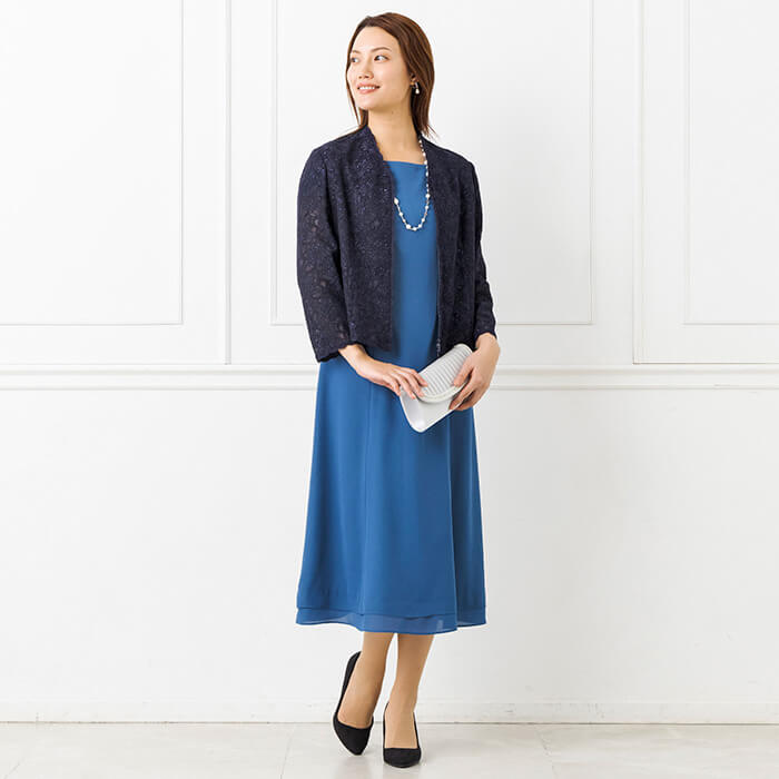 お顔合わせ、結婚式の装いにおすすめのスタイル。パターンは「少しゆったり」タイプを使用した40代~向け。「標準」に比べてウエストを中心にゆとりを持たせています。