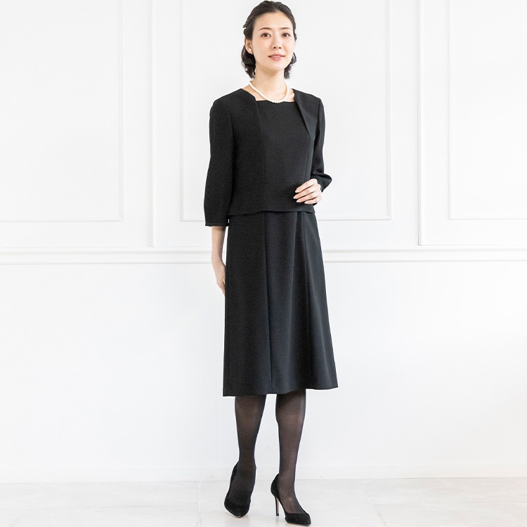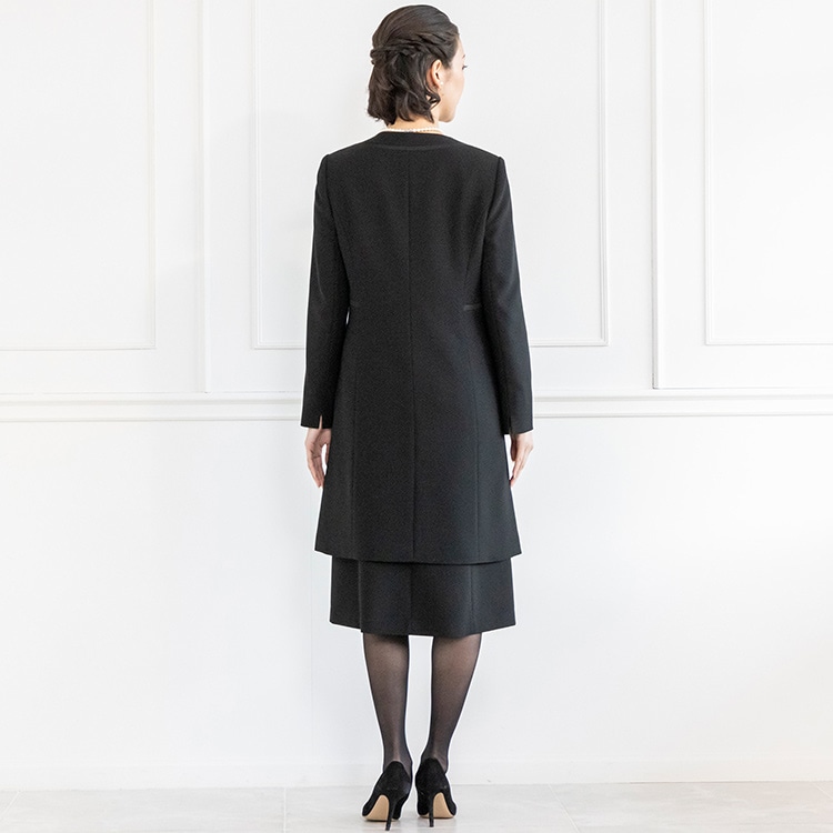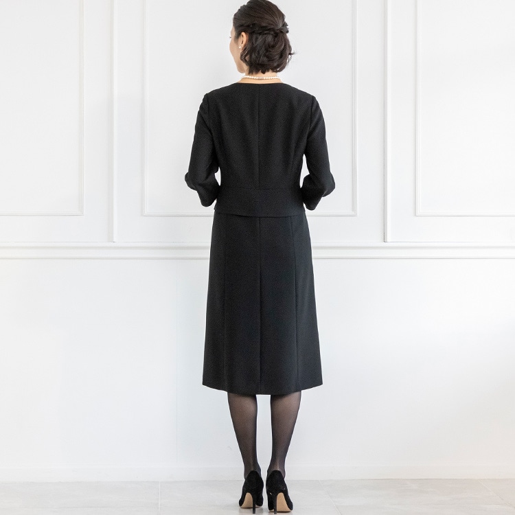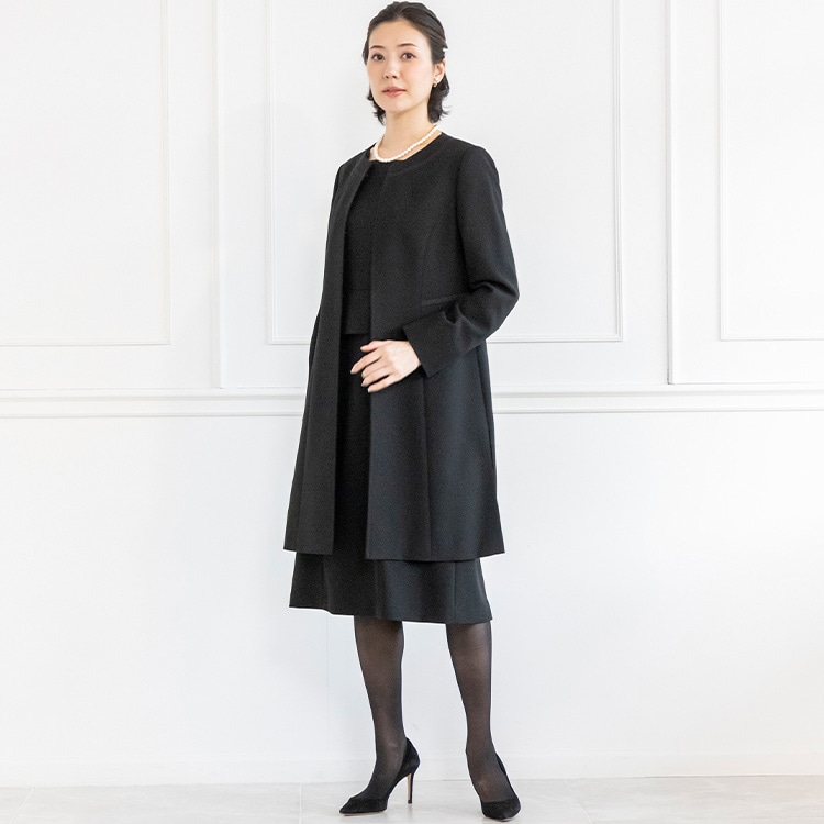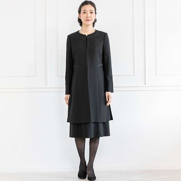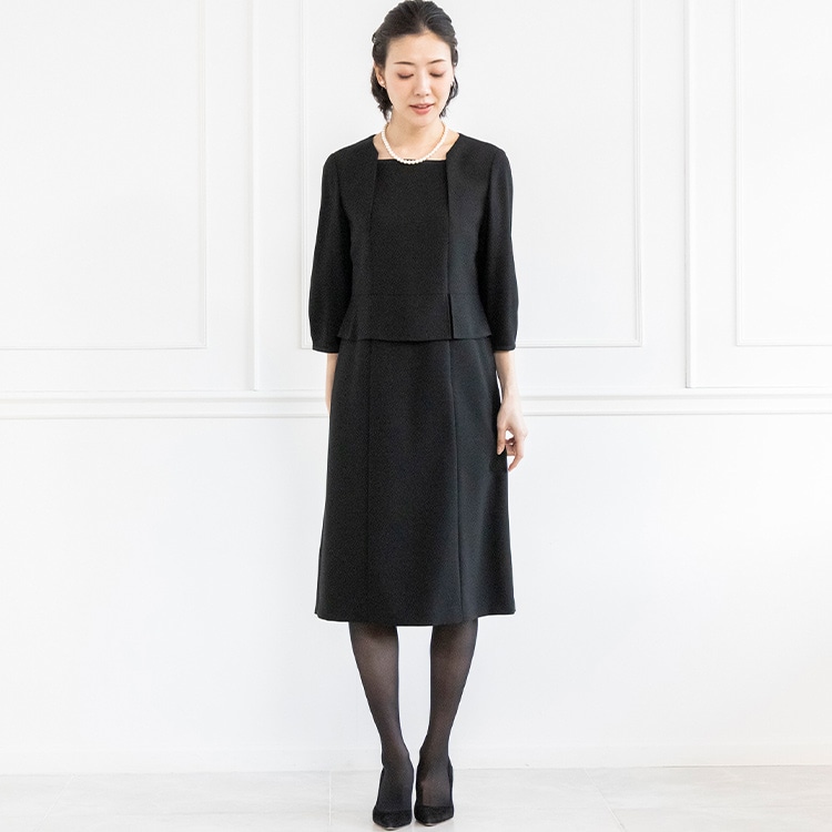 きちんと感のある上品スタイルが完成する2点セットのブラックフォーマル。ボディラインをカバーし、きれいに魅せるロング丈ジャケット。カギホック留めですっきりとした印象に。ワンピースはセパレート見えするこだわりデザイン。着脱がスムーズに出来る前開きタイプ。冠婚葬祭だけでなく、セレモニーやお呼ばれなど幅広いシーンで重宝します。
