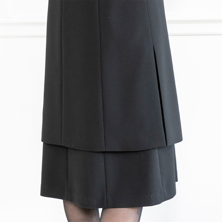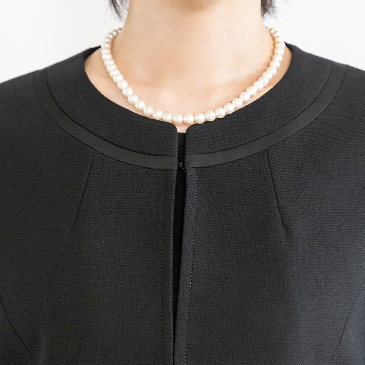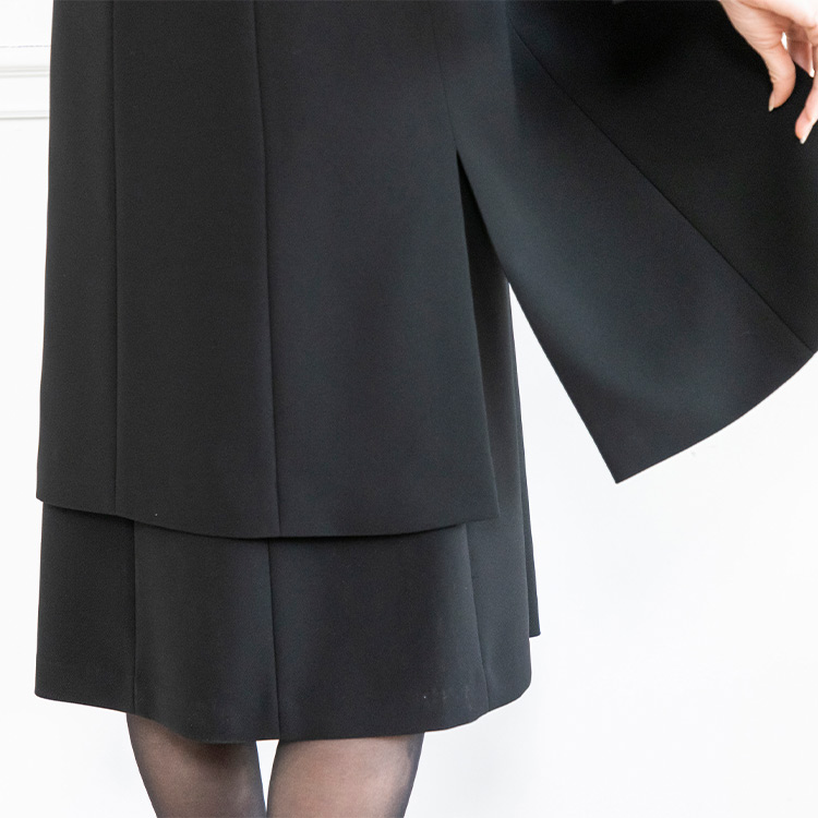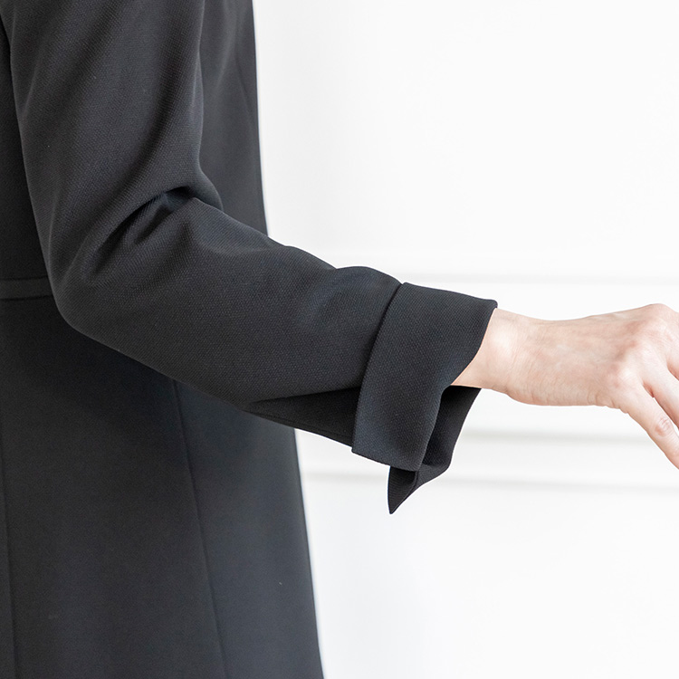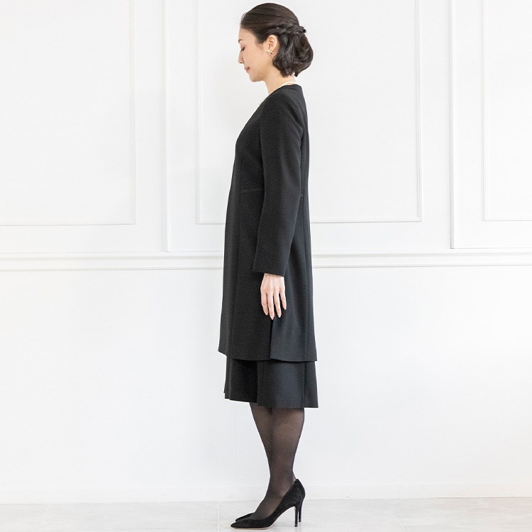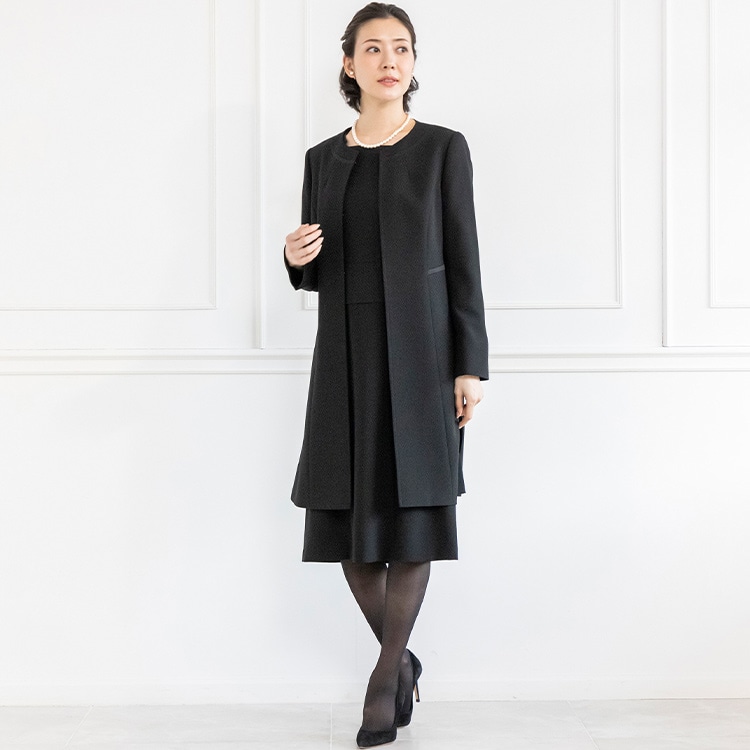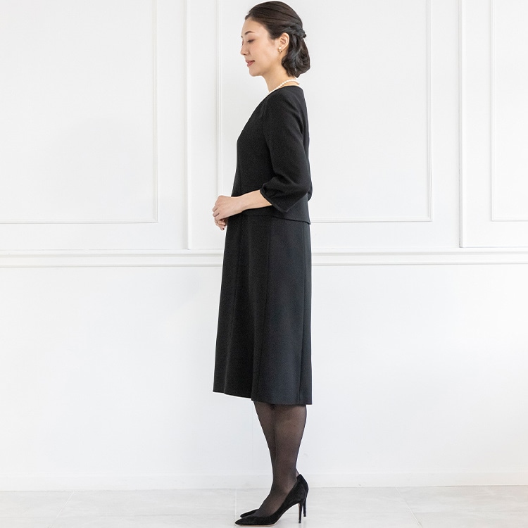 きちんと感のある上品スタイルが完成する2点セットのブラックフォーマル。ボディラインをカバーし、きれいに魅せるロング丈ジャケット。カギホック留めですっきりとした印象に。ワンピースはセパレート見えするこだわりデザイン。着脱がスムーズに出来る前開きタイプ。冠婚葬祭だけでなく、セレモニーやお呼ばれなど幅広いシーンで重宝します。