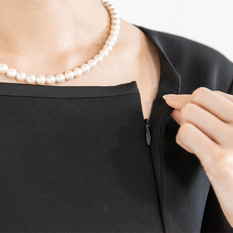 ワンピースは便利な前開きファスナー仕様ワンピースの胸元にファスナーを取り付けました。着脱の際に後ろに手を伸ばす手間がない便利な仕様です。