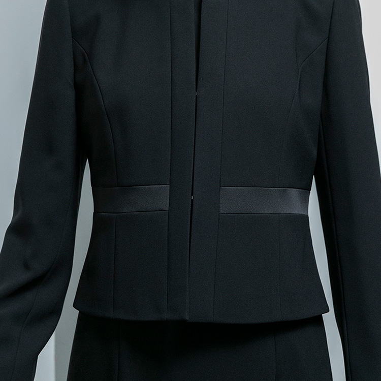 ジャケットはシンプルなノーカラーに衿周り、合わせ部分、そしてウェストラインにサテンの切り替えを入れワンポイントデザインに。