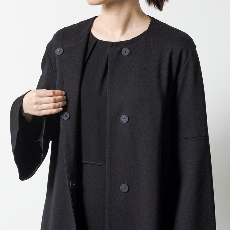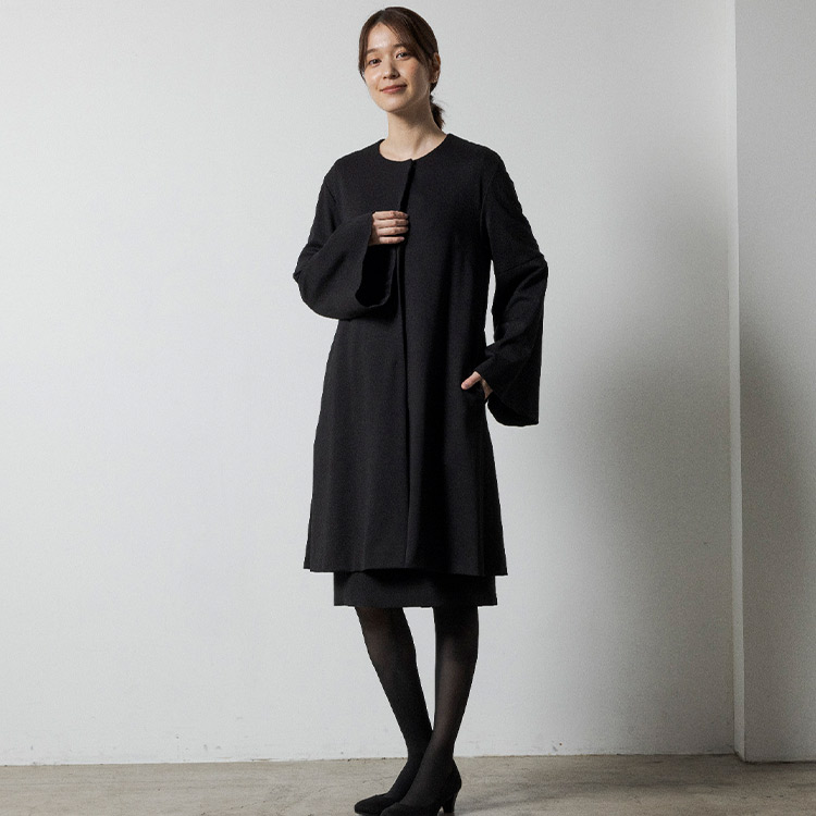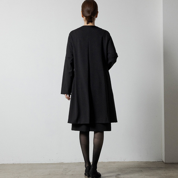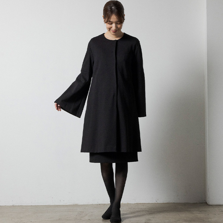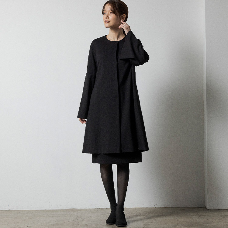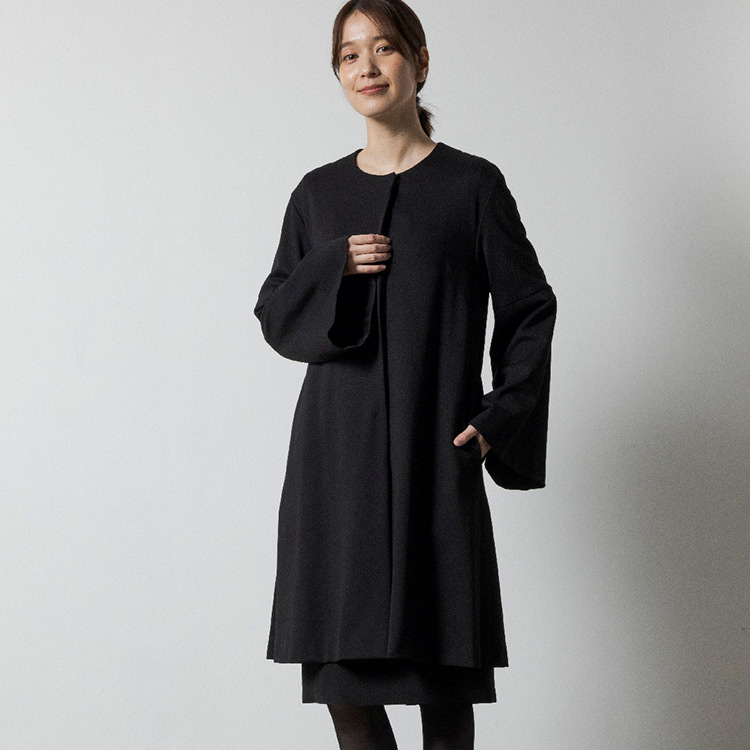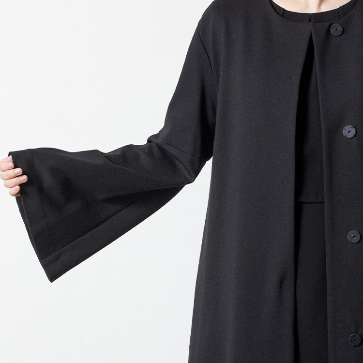 袖がフレアシルエットのロングジャケット。シンプルながらにもエレガントな印象を与えます。ワンピ―スはもちろんパンツに合わせてモードな着こなしを楽しめます。