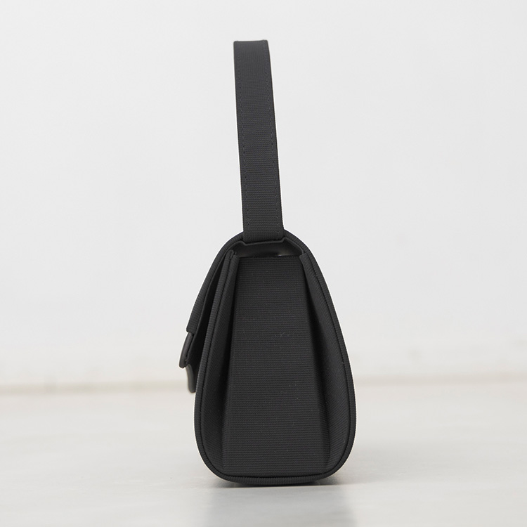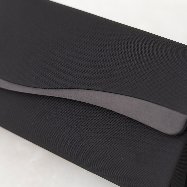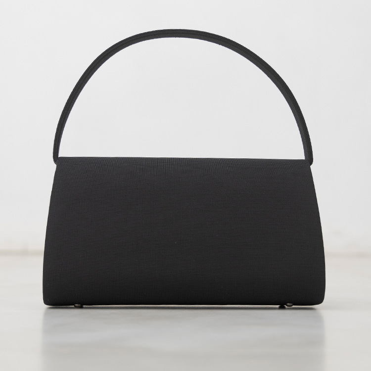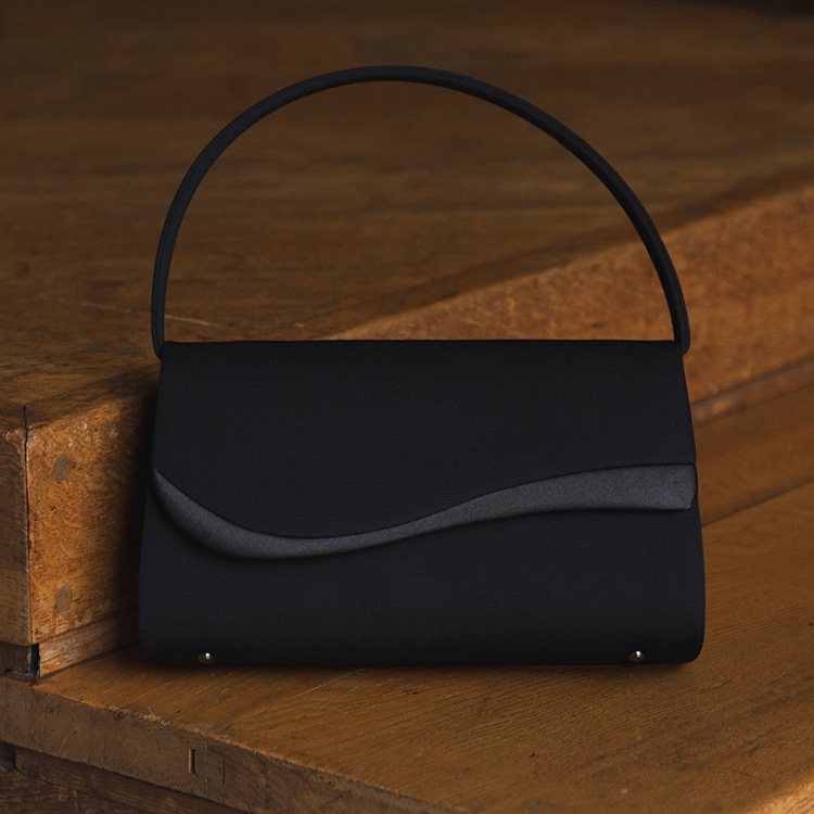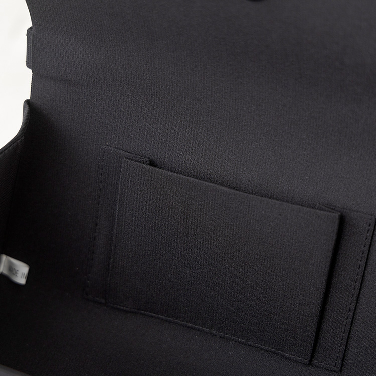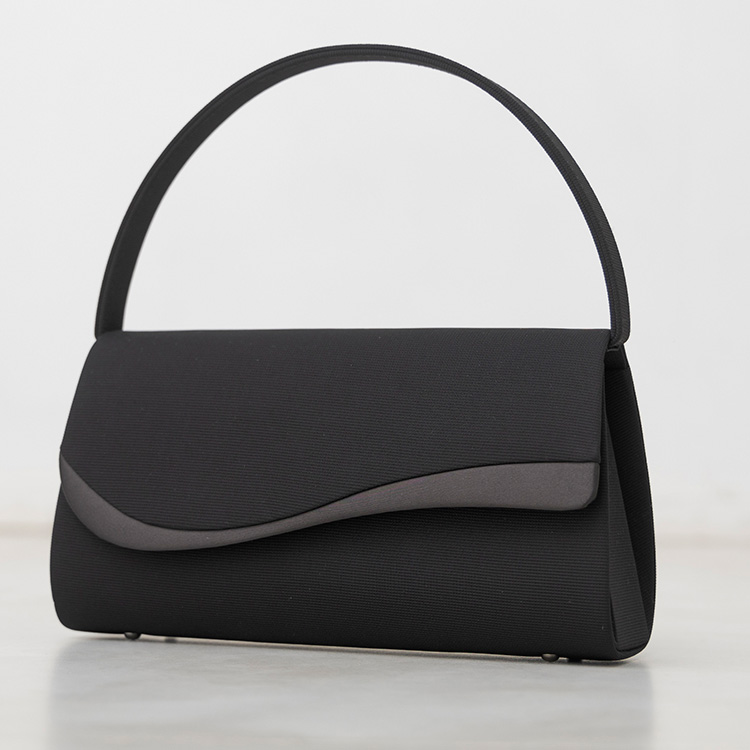 スクエア型のノーブルな印象のブラックバッグ。かぶせ部分の淵に光沢のあるサテン切替えを。流れるようなデザインが優しい女性らしい印象に。マグネットボタンでスムーズな開け閉めができます。底びょう付きで汚れやキズを防ぎます。持つ人や合わせるウェアを選ばないので、長くご愛用いただけます。