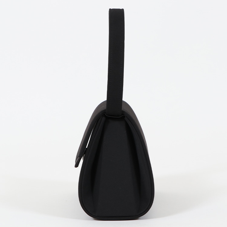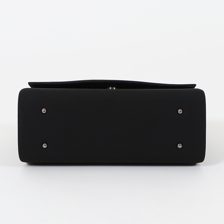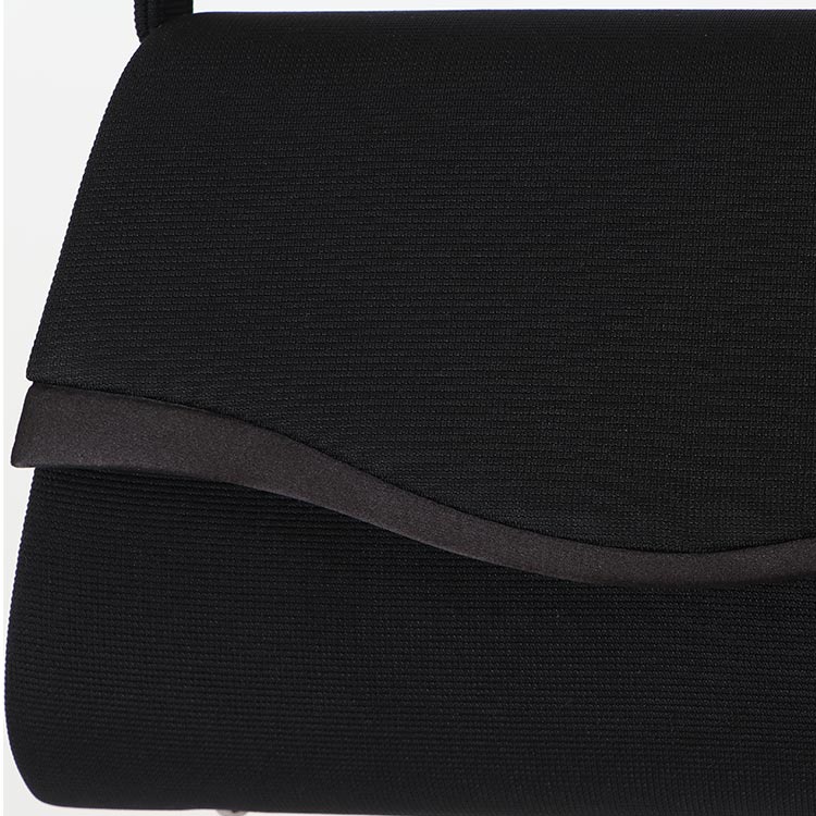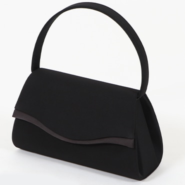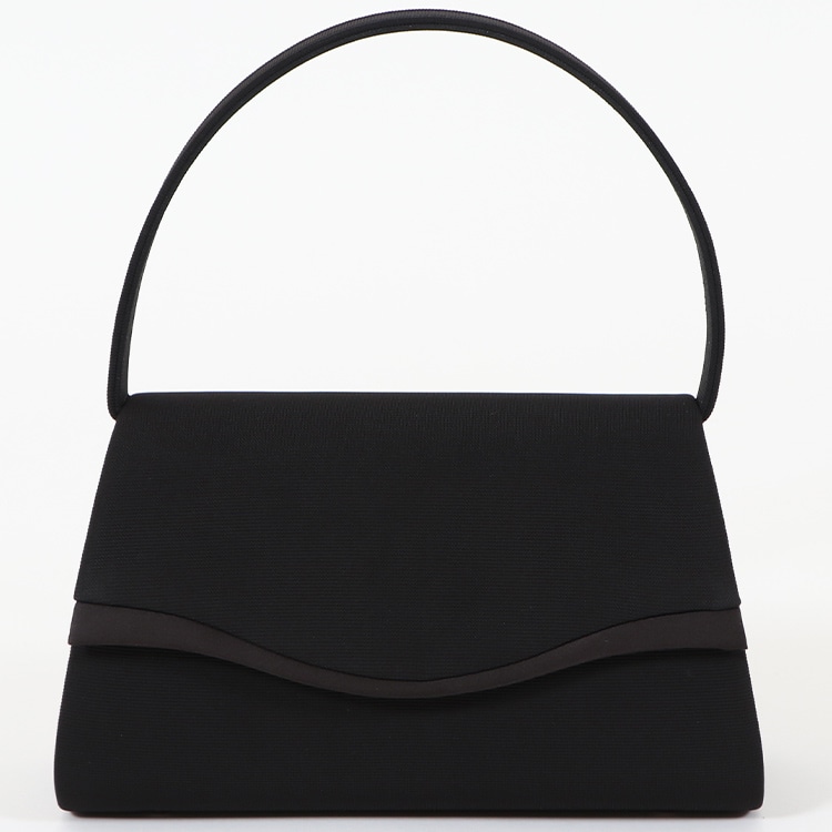 穏やかにカーブを描いたサテン切り替えのブラックバッグ。マグネットボタンでスムーズな開け閉めができます。底びょう付きで汚れやキズを防ぎます。持つ人や合わせるウェアを選ばないので、長くご愛用いただけます。