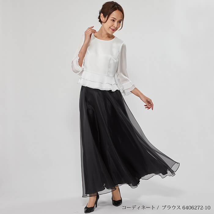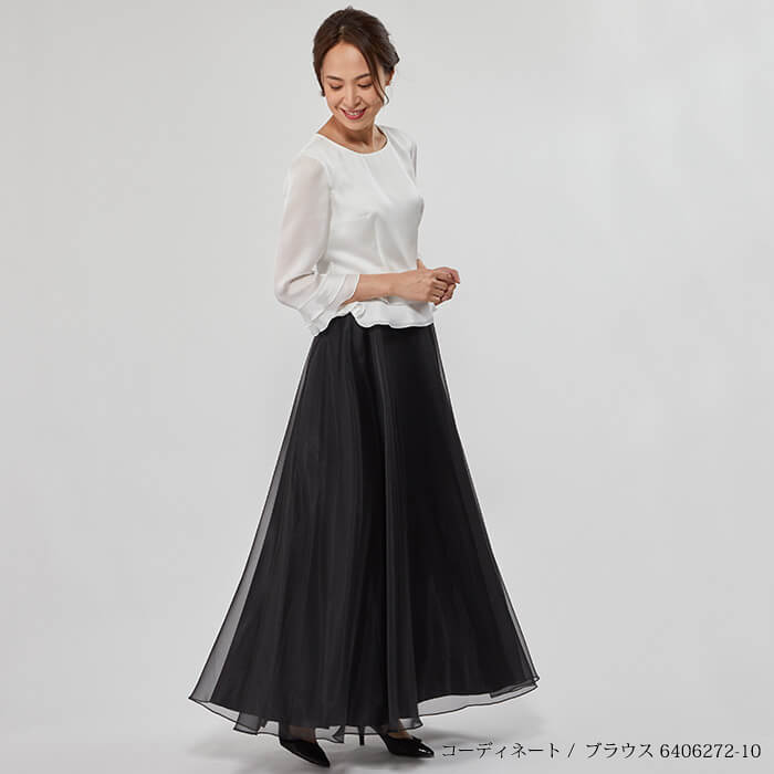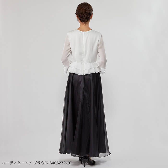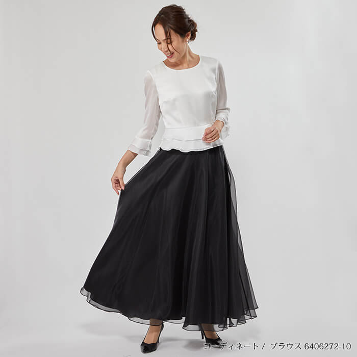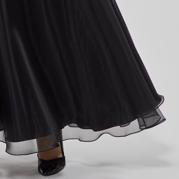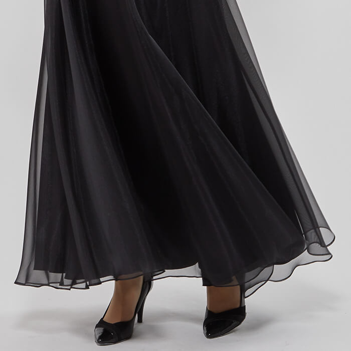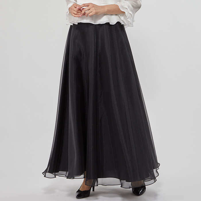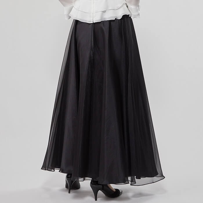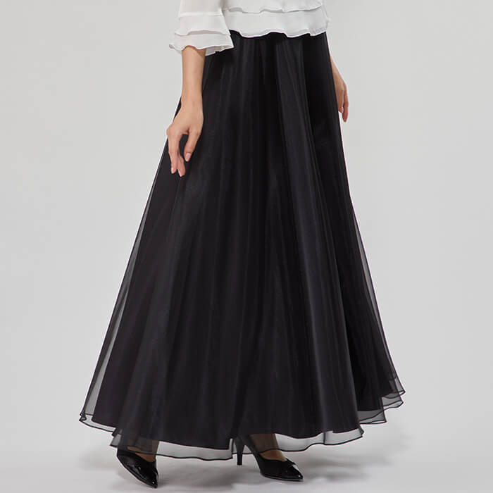 艶のあるサテンの裏地に、たっぷりとフレアーを入れたオーガンジーを重ねた華やかなステージ用ロングスカート。二種類の生地の異なる質感が合わさることにより、美しい陰影が生まれます。ウエストは両サイドゴム入りで呼吸や動きに合わせて伸縮します。裏地もフレアー分量があるので足を広げることもでき、チェロなどの演奏者にもおすすめです。