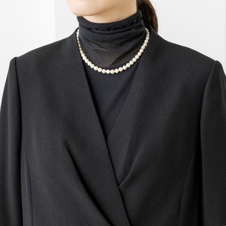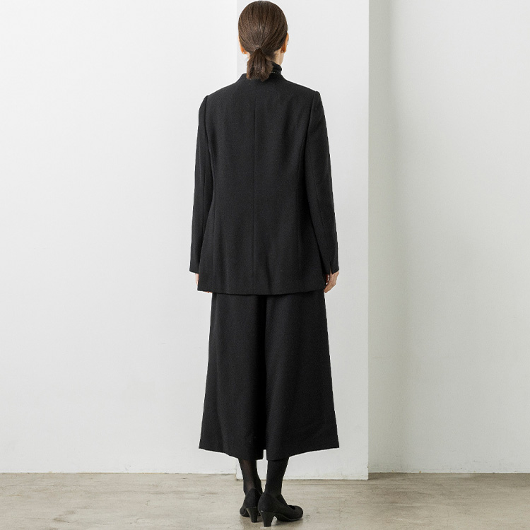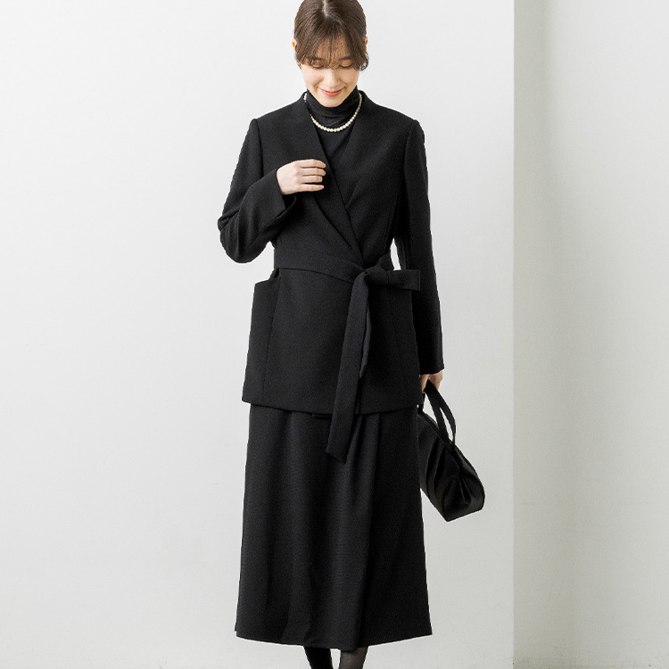 ジャケットの裏地を春夏仕様に半裏としました。春夏秋用のセレモニースーツです。ゆったりシルエットのチュニックジャケットはお尻までカバーアップ。タック使いがエレガントなアシンメトリーデザイン。ボトムはラップスカート風にデザインしたミモレ丈のトリックパンツ。こちらもゆったりシルエットのパンツをラップ風にデザインして気になるシルエットを隠します。付属の共布ベルトを締めるとモダンでスタイルリッシュにイメージチェンジ。学校行事、オフィス、お出掛けやブライダルゲストなど様々なシーンにご着用下さい。もちろん喪服としてもお召し頂けます。