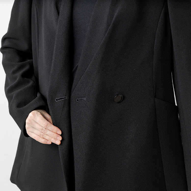 上品なV開きダブルブレストのアシンメトリーリターンカフスジャケット。着丈はお尻も隠れるチュニック丈。春夏秋の3シーズン使い用に半裏仕立て。胸元のタック使いがエレガントで、様々なシーンで着用頂けます。付属の共布ベルトを締めるとXラインでモダンでスタイリッシュに着こなせます。左右にスラッシュポケット付き。両脇裾に、スリット入りで、着心地を良くしています。素材の風合いを活かしウエストを絞らず、身頃のパネル線も切替え位置を脇に寄せました。軽くて優しい風合いの着心地をお楽しみ下さい。