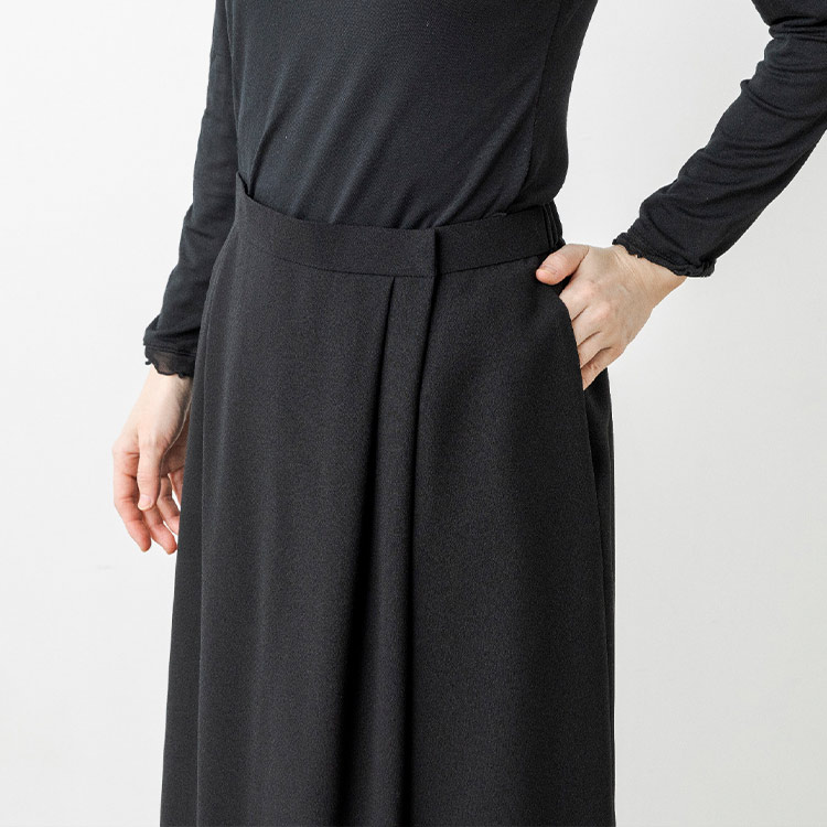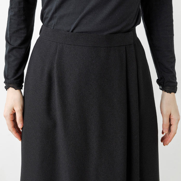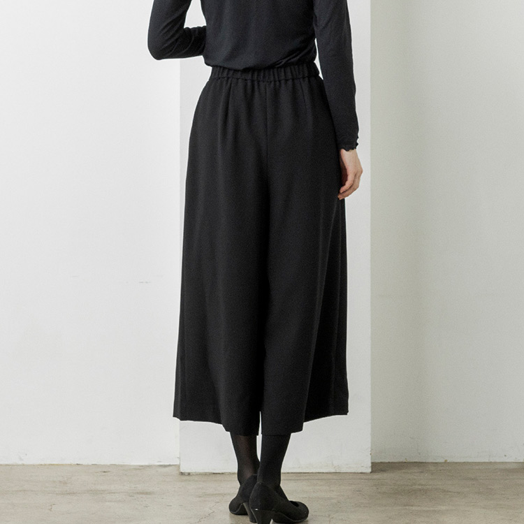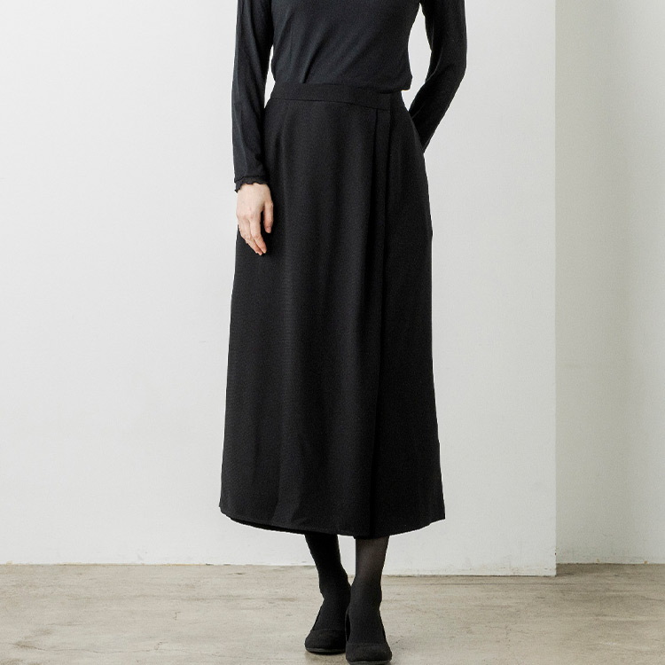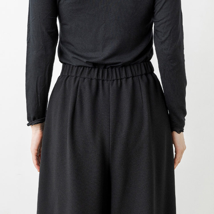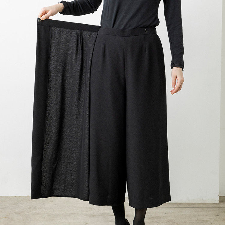 パンツをラップスカート風にデザインすることで、気軽で楽に履けるパンツをエレガントにご着用出来ます。ウエストの後身部分はゴム仕様。総裏仕様なので通年物としてご着用頂けます。左脇にポケット有り。単品使いとしてもコーデし易いデザインです。
