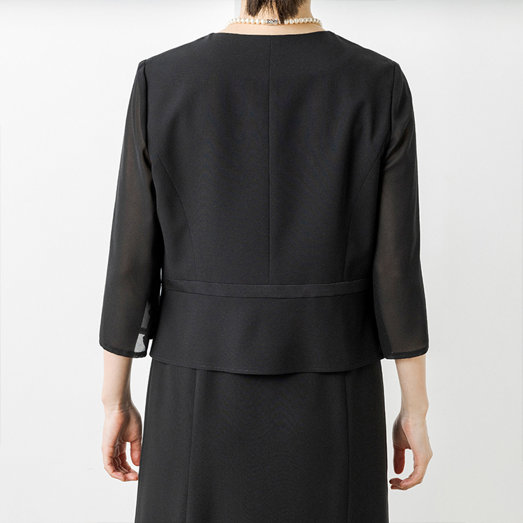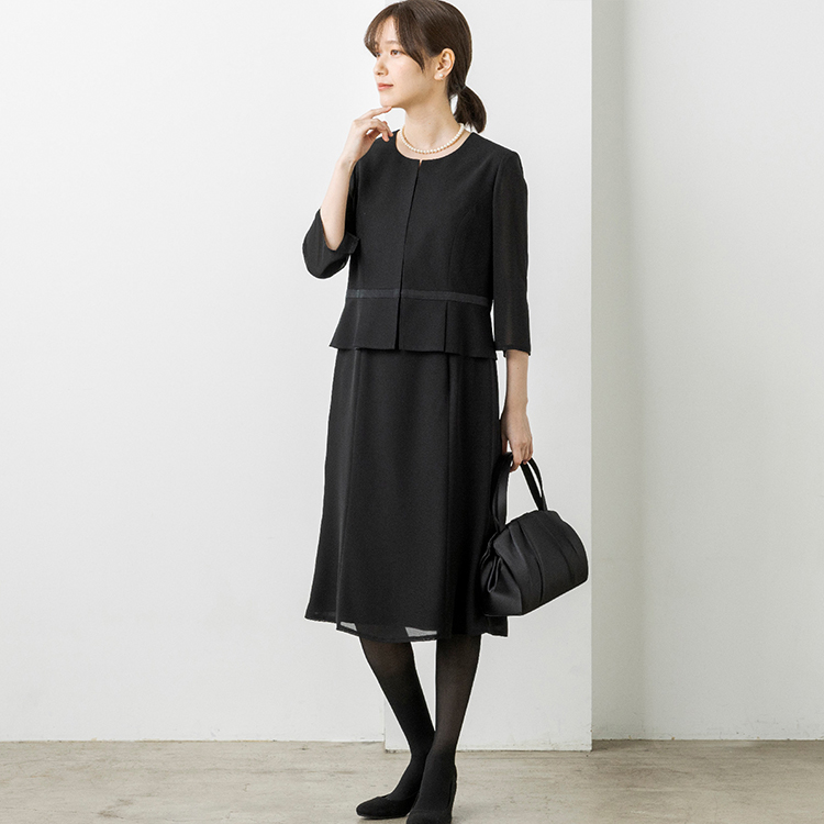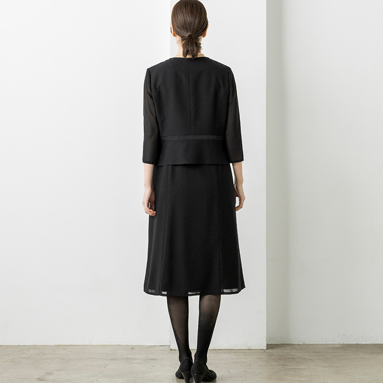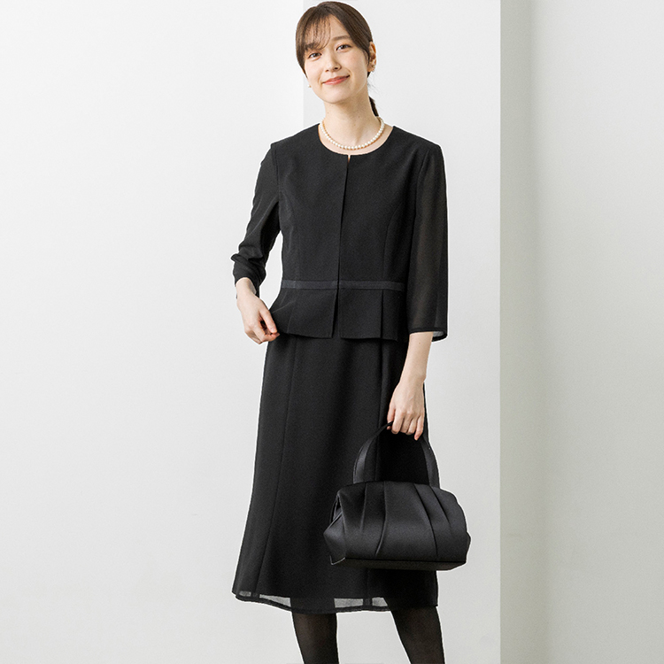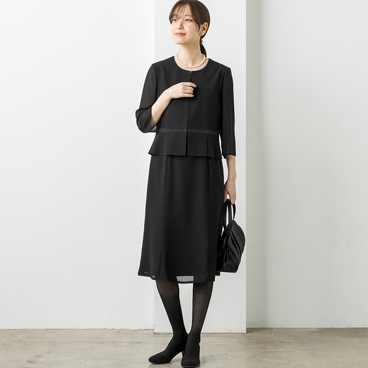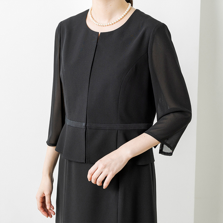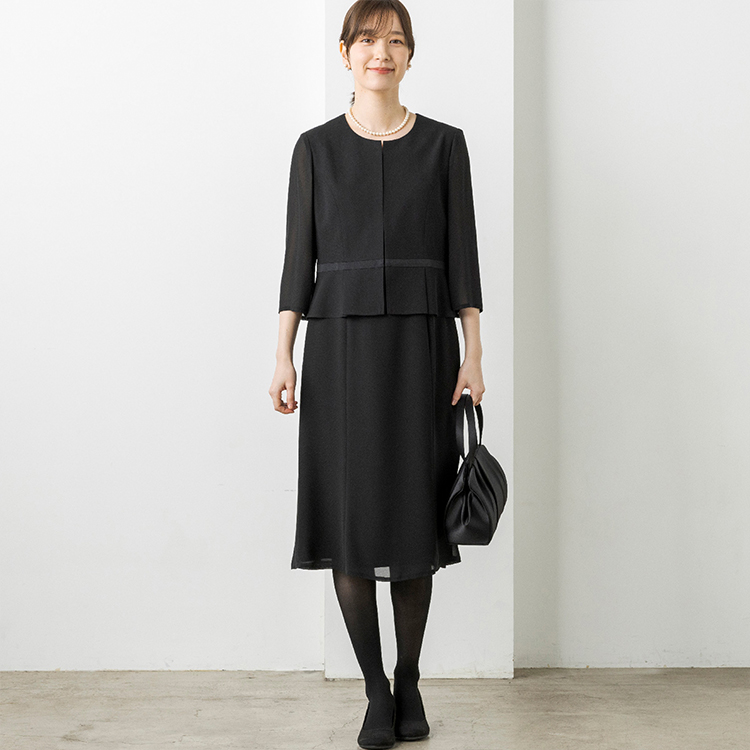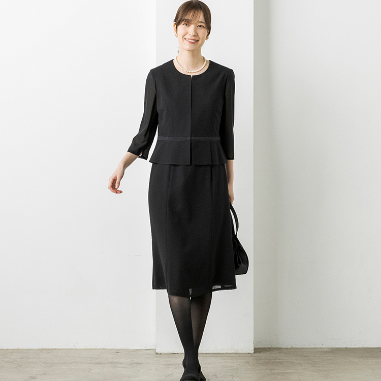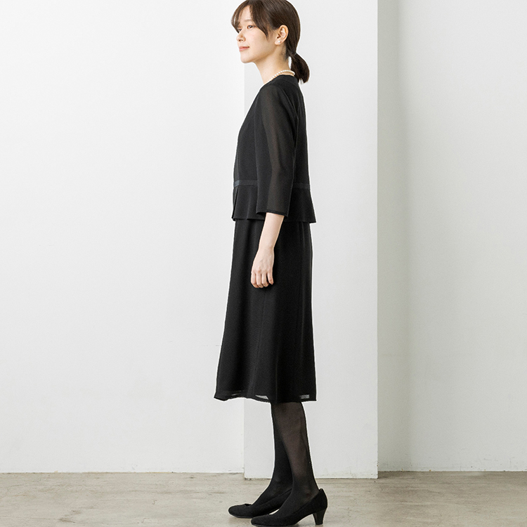 上身頃部分の裾はペプラムデザインを採用し、気になるお腹周りをカバーしてくれます。スカート部分はふんわりとしたフレアシルエットにし、エレガントな雰囲気に仕上げました。